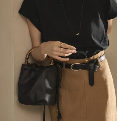 黒のワンピースにバンブーハンドルを合わせて。